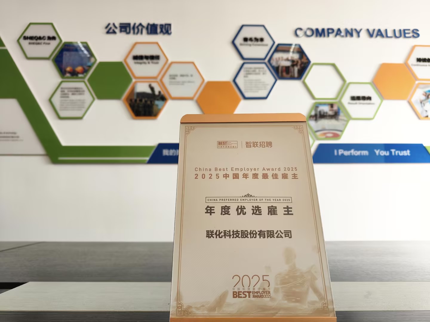 近日,在智聯招聘聯合北京大學社會調查研究中心、北京大學國家發展研究院等權威機構共同主辦的“2025中國年度最佳雇主”評選活動中,聯化科技憑借在人才體係建設、雇主品牌打造和員工發展機製等方麵的突出表現,榮獲“2025中國年度最佳雇主--年度優選雇主”稱號。