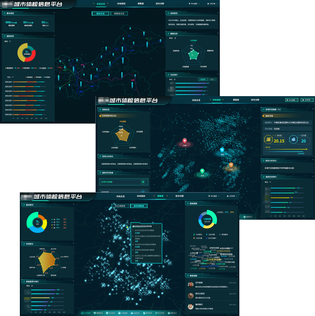 u 城市體檢主要涵蓋四個步驟: 一、指標體係構建,深度融合國家製定的50項通用指標體係,充分考慮各類城市更新過程中針對性、創新性指標評價需求,建立了100+項綜合評價指標庫; 二、多源數據彙聚,利用係統數據對接、手動信息維護等多種方式,建立規劃、經濟、民生等城市信息數據通道,依托數據同步、職能部門數據填報與數據算法聯動,確保分析評價結果動態更新、精準評價; 三、指標計算模型,平台在城市體檢指標指南及“一城一策略”指標體係的基礎上,根據城市在不同維度指標體係中的評分權重,製定符合城市特色的指標算法模型,從各城市特色出發,重點關注城市熱點問題,滿足其地域經濟特色條件下的發展需求; 四、體檢賦能決策,通過滿意度調查、指標設計、指標計算分析等,結合城市體檢各項指標計算結果、文本成果、圖表成果、空間專題數據等生成綜合性城市體檢報告,為城市的各項重要管理決策提供數據支撐,進而推動城市結構優化和品質提升。 |