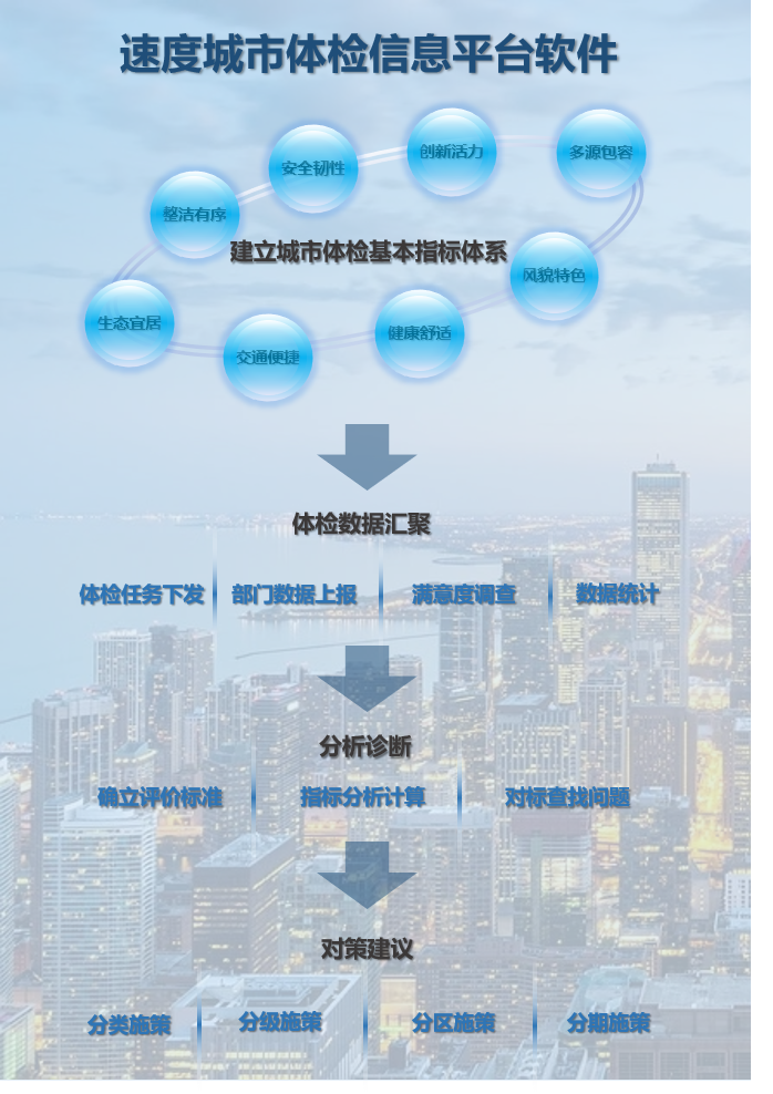 結合中共中央城市工作會議精神,落實住建部開展城市體檢工作相關意見,建立統一收集、統一管理、統一報送的“速度城市體檢信息平台”,是城市人居環境係統評價、發現“城市病”、開展治理行動、提升城市居民滿意度和幸福感的重要手段,在城市建設、更新、健康發展過程中發揮著引領推動作用,同時借助智能化創新模式,貫徹“體檢-診斷-治療”總體思路,推動城市高質量發展、提高城市綜合競爭力。
