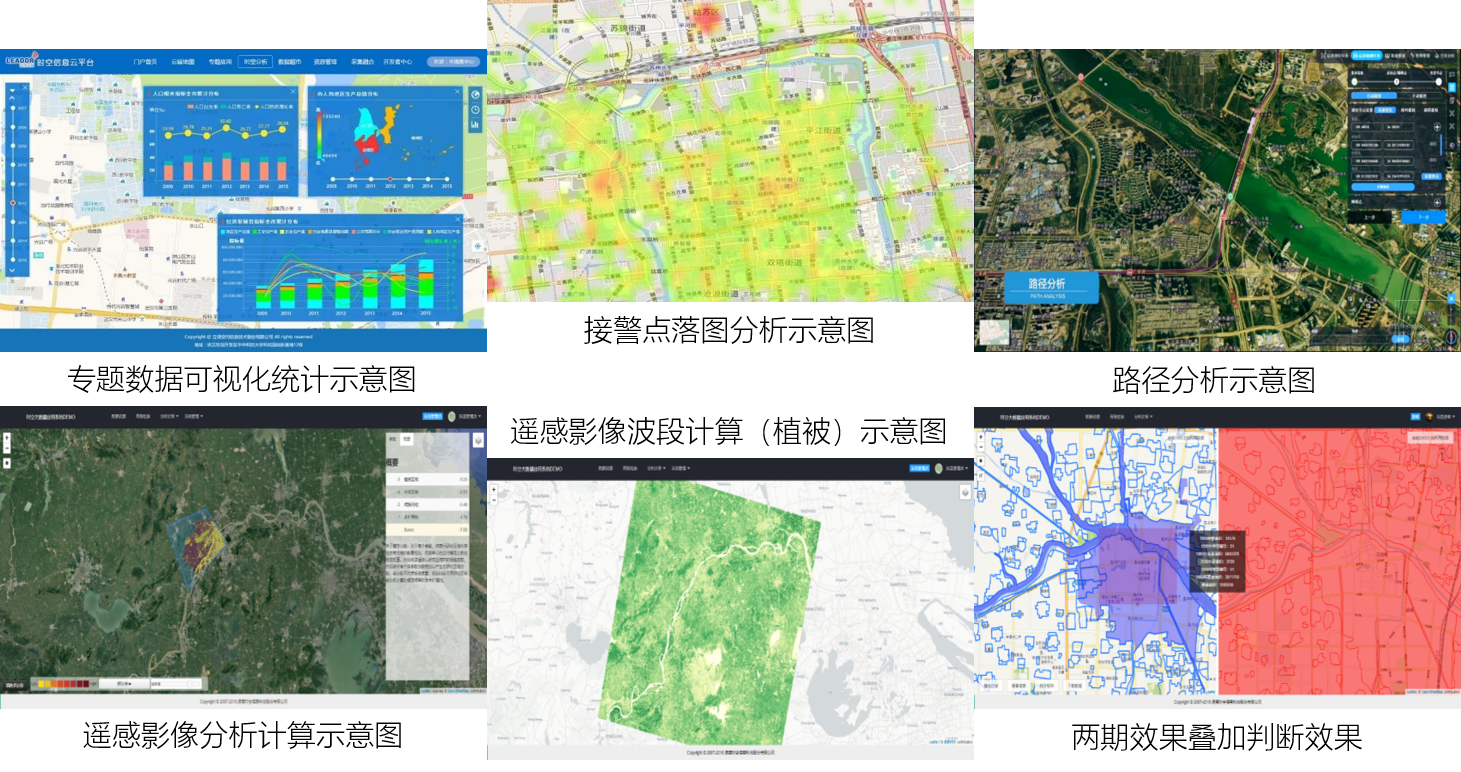 時空大數據分析:根據數據挖掘分析和可視化分析需求,構建大數據分析模型庫,對時空信息進行深入挖掘,使海量數據的處理、分析、統計和共享變得便捷。包括大數據分析模型庫構建、綜合統計服務、海量名址匹配與落圖分析、基於GPS軌跡熱力分析、遙感影像變化時空分析、遙感影像地物識別、渣土垃圾傾倒識別。