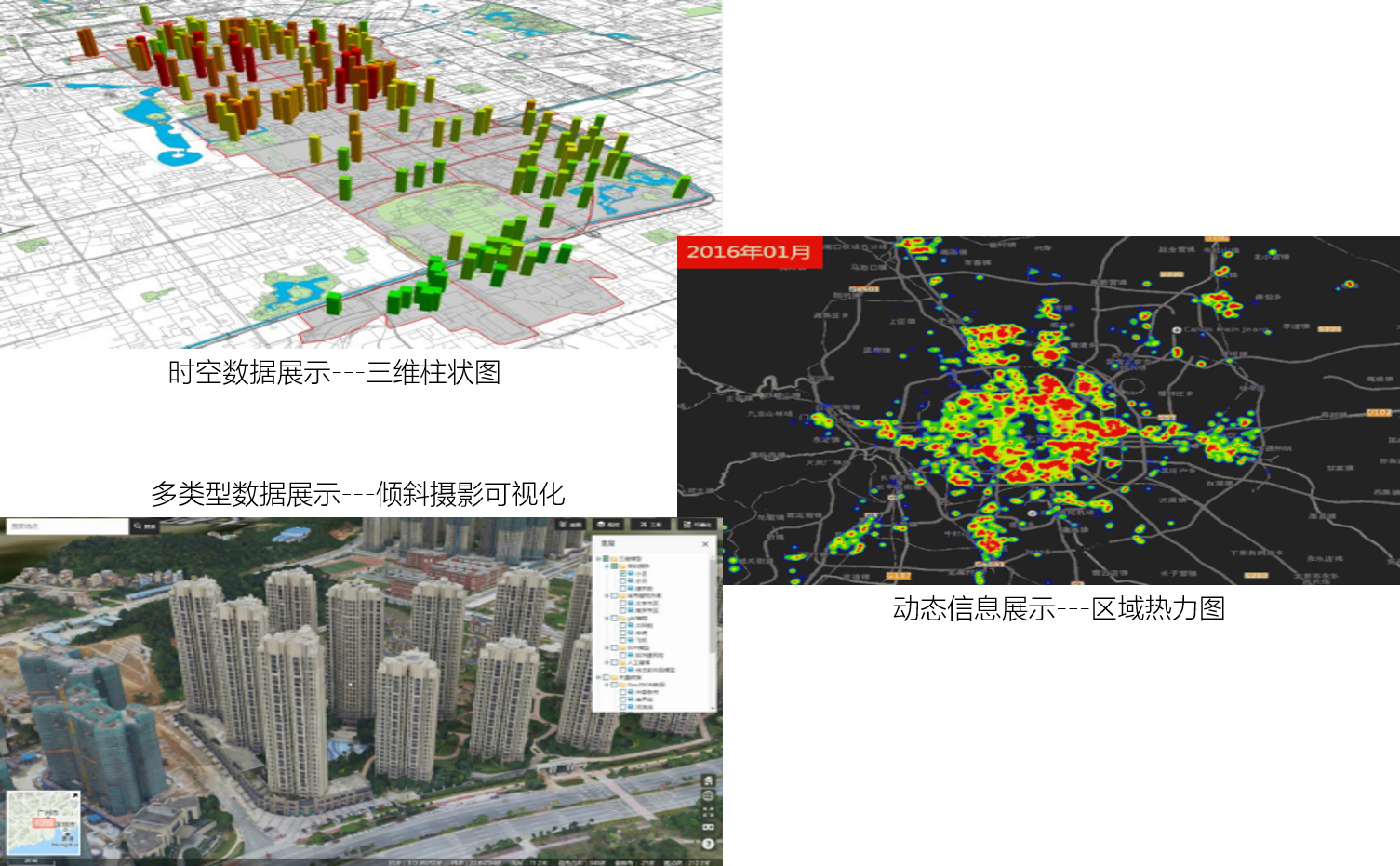 多維數據可視化展示:係統提供多維數據可視化展示功能,包括時空數據展示、動態信息展示和多類型數據展示等,從而滿足對城市空間不同細節程度的直觀、高效地表達。通過先進的定位、融合、建模等技術,生成真實的三維城市模型及實現動態信息上圖展示,便於用戶實時掌握綜合信息。
