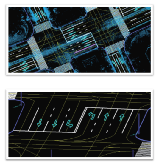 高精地圖采集:高精度地圖不僅有高精度的坐標,同時還有準確的車道形狀和每個車道的坡度、曲率、航向、高程、側傾等信息,它可以為車輛提供高精度(厘米級)的先驗信息,這會大大緩解無人駕駛車輛實時感知的壓力,降低實時感知的難度。通過高精度移動測量係統,采集城市市政道路高精度地圖數據,采集內容包括道路路麵車道標線、人行橫道線、車道中心線、道路附屬設施等道路信息,建立城市路段高精度地圖。