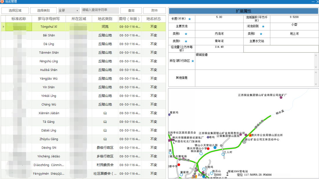 實現對居民點、交通運輸線路、街路巷、水利水電設施、紀念地與風景點、建築物、陸地水係以及陸地地形等區域的地名管理,係統根據地名管理工作的不同級別設置使用權限,係統提供地名添加、地名變更、地名注銷、地名信息更新維護、地名的曆史回溯等功能。