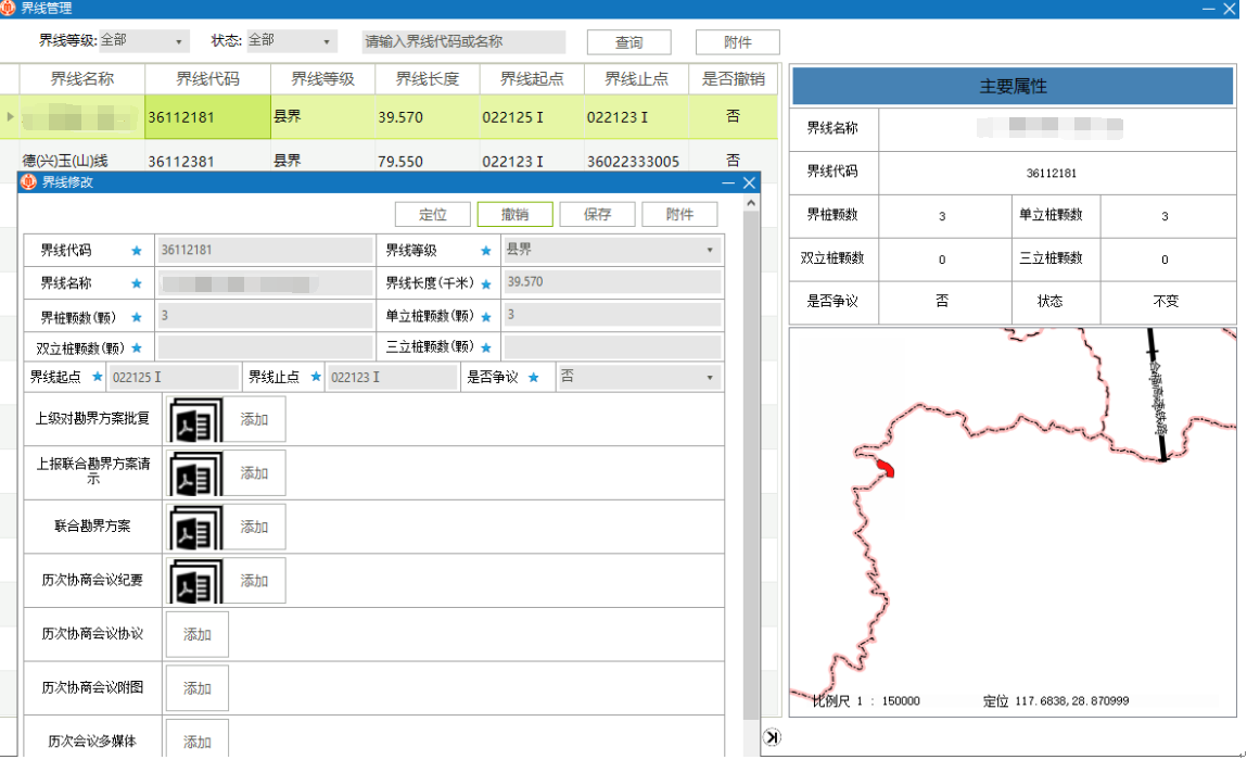 實現界線、界樁的管理維護和日常檢查工作,包括信息的登記、編輯、刪除,以及相關電子文檔和多媒體資料的入庫和管理工作、界線邊界糾紛管理工作,以及設立、撤銷、合並、更名、基礎數據補漏、流程審批。