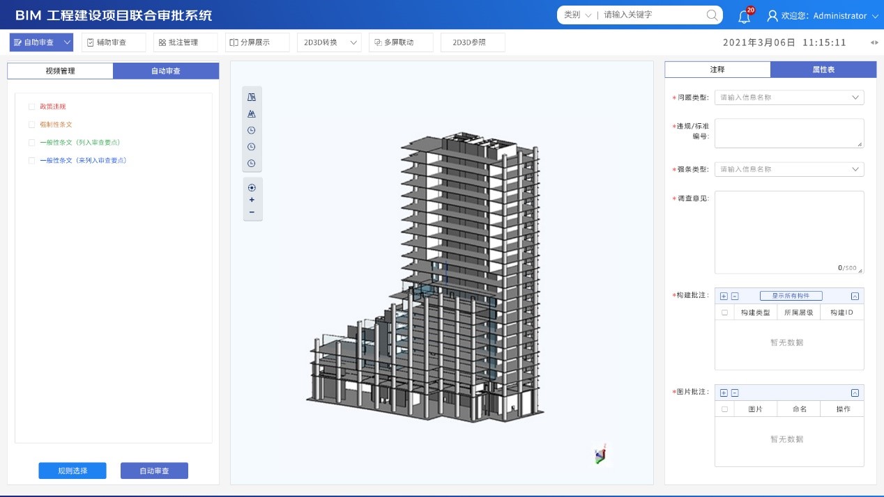 係統可實現平麵圖形與立體模型的交互展示和審查,批注與模型構件的精準掛接,有助於推動方案設計、審查向參數化、可視化的方向發展,有效解決傳統審查方式周期長、設計效果不直觀等問題。